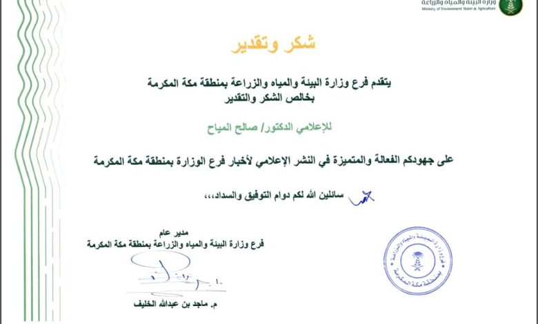 كرمت وزارة البيئة والمياه والزراعة في منطقة مكة المكرمة رئيس الاتحاد العربي للإعلام الالكتروني الدكتور صالح المياحي بشهادة شكر وتقدير تثمينا لجهوده الاعلامية في تغطية أخبار الوزارة ونقلها بأسلوب احترافي مؤثر.
